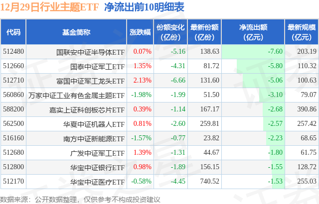 当日有164只行业主题ETF基金出现资金净流出,其中净流出排首位的是国联安中证半导体ETF(512480),份额减少了5.16亿份,净流出额为7.6亿元。