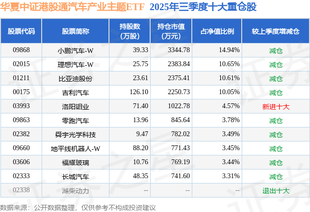 华夏中证港股通汽车产业主题ETF基金成立于2024年12月30日,基金经理为华龙,基金跟踪标的为中证港股通汽车产业主题指数,成立以来超额回报为3.57%,近一个月超额回报为-0.48%。最新披露的基金持仓数据显示,截止2025年9月30日,该基金第一大重仓股为小鹏汽车-W(09868),持股占比为14.94%。