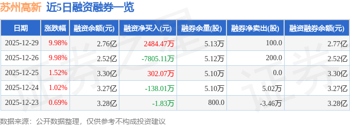 苏州高新融资融券信息显示,融资方面,当日融资买入9492.02万元,融资偿还7007.55万元,融资净买入2484.47万元。融券方面,融券卖出100.0股,融券偿还0.0股,融券余量5.13万股,融券余额37.3万元。融资融券余额2.77亿元。
