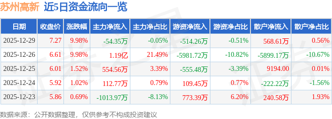 证券之星消息,截至2025年12月29日收盘,苏州高新(600736)报收于7.27元,上涨9.98%,已连续涨停2天,换手率12.37%,成交量142.36万手,成交额10.11亿元。