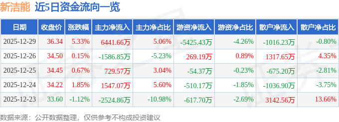 证券之星消息,截至2025年12月29日收盘,新洁能(605111)报收于36.34元,上涨5.33%,换手率8.35%,成交量34.7万手,成交额12.73亿元。
