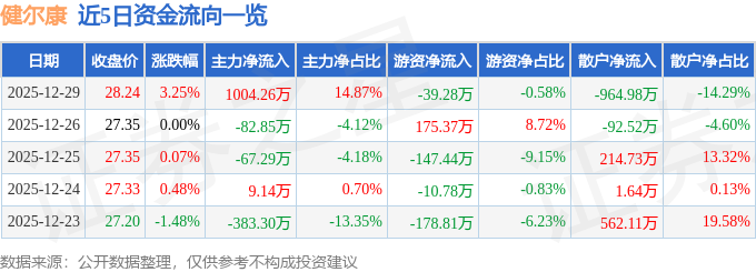 证券之星消息,截至2025年12月29日收盘,健尔康(603205)报收于28.24元,上涨3.25%,换手率5.81%,成交量2.4万手,成交额6751.59万元。