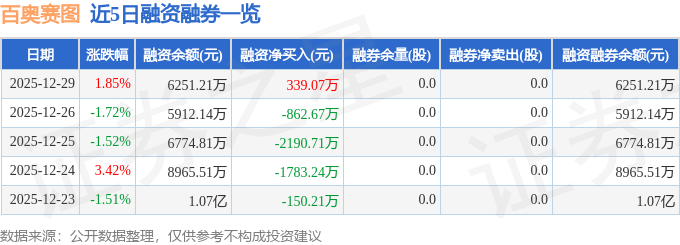 百奥赛图融资融券信息显示,融资方面,当日融资买入1592.72万元,融资偿还1253.65万元,融资净买入339.07万元。融券方面,融券卖出0.0股,融券偿还0.0股,融券余量0.0股,融券余额0.0万元。融资融券余额6251.21万元。
