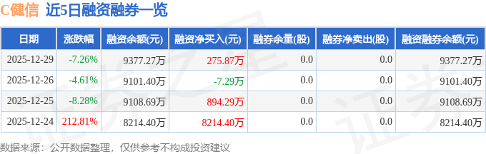 C健信融资融券信息显示,融资方面,当日融资买入2849.92万元,融资偿还2574.05万元,融资净买入275.87万元。融券方面,融券卖出0.0股,融券偿还0.0股,融券余量0.0股,融券余额0.0万元。融资融券余额9377.27万元。