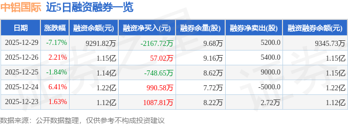 证券之星消息,截至2025年12月29日收盘,中铝国际(601068)报收于5.57元,下跌7.17%,换手率3.18%,成交量81.29万手,成交额4.52亿元。