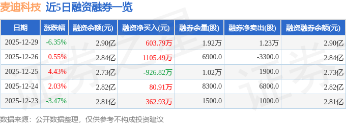 证券之星消息,截至2025年12月29日收盘,麦迪科技(603990)报收于15.33元,下跌6.35%,换手率11.73%,成交量35.94万手,成交额5.5亿元。