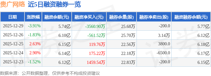 证券之星消息,截至2025年12月29日收盘,贵广网络(600996)报收于10.32元,下跌3.91%,换手率2.18%,成交量27.12万手,成交额2.86亿元。