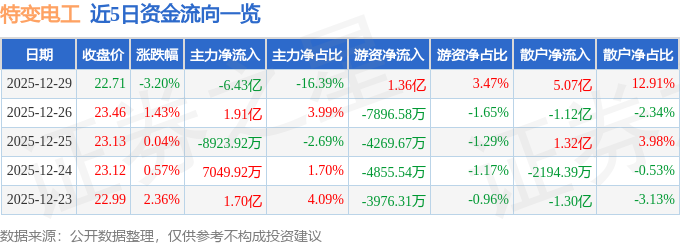 证券之星消息,截至2025年12月29日收盘,特变电工(600089)报收于22.71元,下跌3.2%,换手率3.4%,成交量171.73万手,成交额39.26亿元。