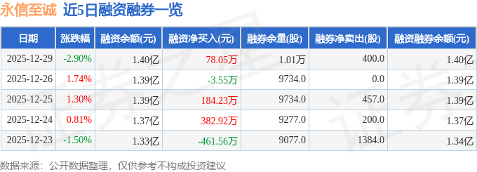 永信至诚融资融券信息显示,融资方面,当日融资买入1302.26万元,融资偿还1224.21万元,融资净买入78.05万元。融券方面,融券卖出400.0股,融券偿还0.0股,融券余量1.01万股,融券余额24.11万元。融资融券余额1.4亿元。