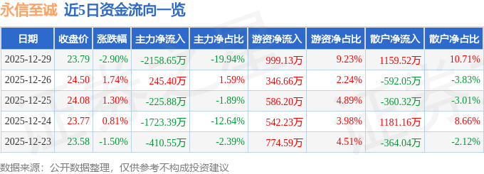 证券之星消息,截至2025年12月29日收盘,永信至诚(688244)报收于23.79元,下跌2.9%,换手率3.0%,成交量4.53万手,成交额1.08亿元。