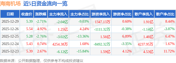 证券之星消息,截至2025年12月29日收盘,海南机场(600515)报收于5.39元,下跌2.71%,换手率4.49%,成交量412.44万手,成交额22.61亿元。