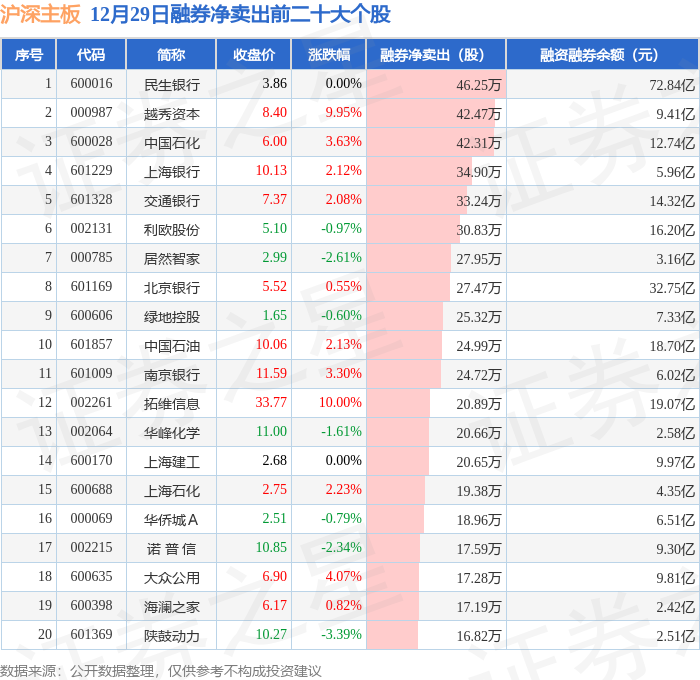 沪深主板融券净卖出前三分别为:民生银行(600016)融券净卖出46.25万股、越秀资本(000987)融券净卖出42.47万股、中国石化(600028)融券净卖出42.31万股,前20具体见下表: