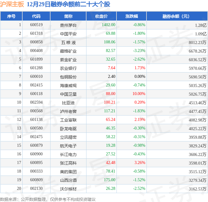沪深主板融券余额前三分别为:贵州茅台(600519)融券余额1.28亿元、中国平安(601318)融券余额1.09亿元、五 粮 液(000858)融券余额8012.23万元,前20具体见下表: