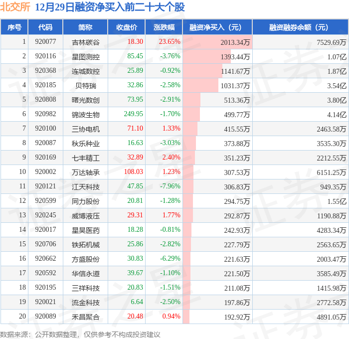 北交所融资净买入前三分别为:吉林碳谷(920077)融资净买入2013.34万元、星图测控(920116)融资净买入1393.44万元、连城数控(920368)融资净买入1141.67万元,前20具体见下表: