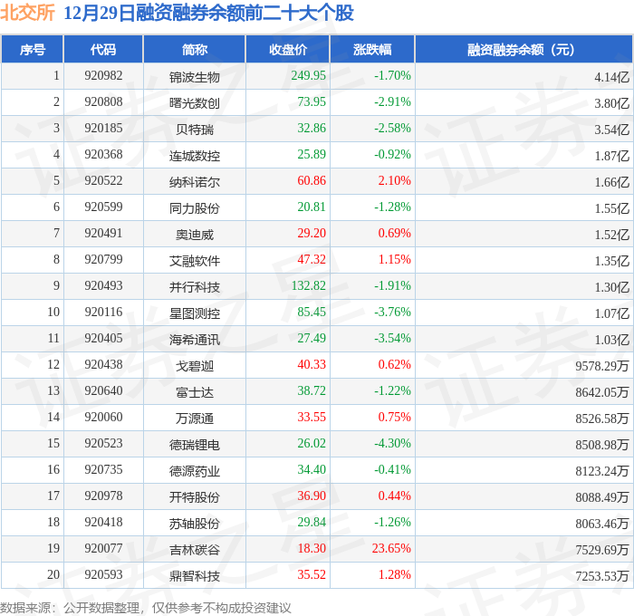 北交所融资融券余额前三分别为:锦波生物(920982)融资融券余额4.14亿元、曙光数创(920808)融资融券余额3.8亿元、贝特瑞(920185)融资融券余额3.54亿元,前20具体见下表: