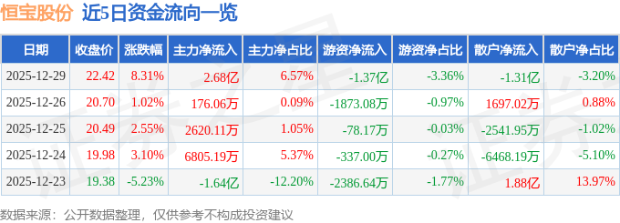 证券之星消息,截至2025年12月29日收盘,恒宝股份(002104)报收于22.42元,上涨8.31%,换手率31.53%,成交量189.11万手,成交额40.74亿元。
