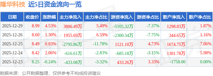 证券之星消息,截至2025年12月29日收盘,隆华科技(300263)报收于8.99元,上涨4.53%,换手率7.94%,成交量77.45万手,成交额6.93亿元。