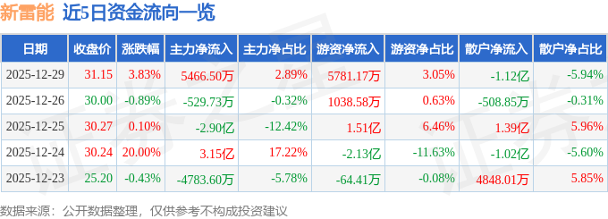 证券之星消息,截至2025年12月29日收盘,新雷能(300593)报收于31.15元,上涨3.83%,换手率13.83%,成交量62.26万手,成交额18.93亿元。