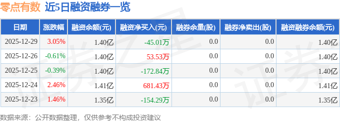 零点有数融资融券信息显示,融资方面,当日融资买入922.71万元,融资偿还967.72万元,融资净偿还45.01万元。融券方面,融券卖出0.0股,融券偿还0.0股,融券余量0.0股,融券余额0.0万元。融资融券余额1.4亿元。