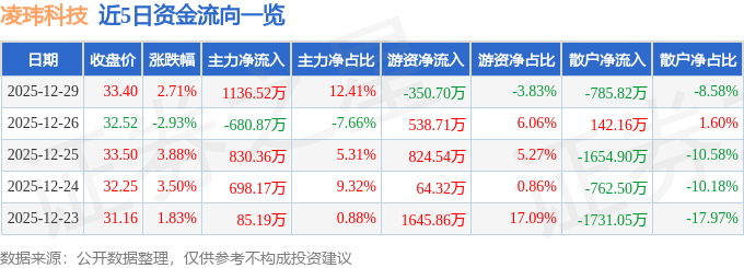 证券之星消息,截至2025年12月29日收盘,凌玮科技(301373)报收于33.4元,上涨2.71%,换手率7.08%,成交量2.72万手,成交额9155.46万元。