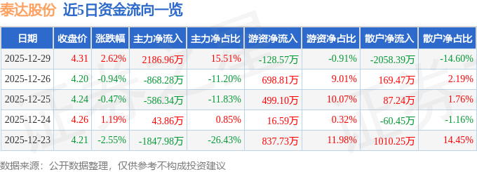 证券之星消息,截至2025年12月29日收盘,泰达股份(000652)报收于4.31元,上涨2.62%,换手率2.23%,成交量32.92万手,成交额1.41亿元。