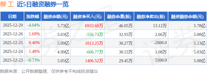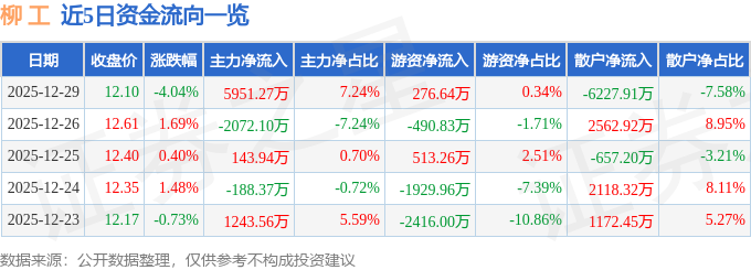 证券之星消息,截至2025年12月29日收盘,柳 工(000528)报收于12.1元,下跌4.04%,换手率3.32%,成交量67.41万手,成交额8.22亿元。