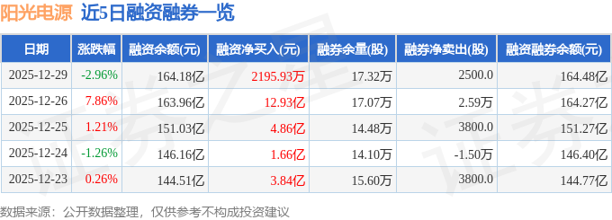 阳光电源融资融券信息显示,融资方面,当日融资买入18.11亿元,融资偿还17.89亿元,融资净买入2195.93万元,连续3日净买入累计18.02亿元。融券方面,融券卖出1.07万股,融券偿还8200.0股,融券余量17.32万股,融券余额3044.17万元。融资融券余额164.48亿元。