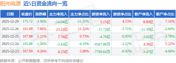 证券之星消息,截至2025年12月29日收盘,阳光电源(300274)报收于175.72元,下跌2.96%,换手率4.4%,成交量69.89万手,成交额124.2亿元。