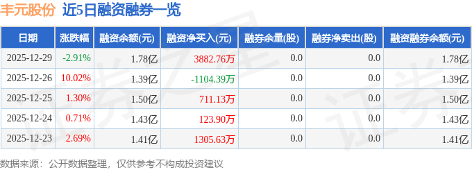 丰元股份融资融券信息显示,融资方面,当日融资买入9517.49万元,融资偿还5634.73万元,融资净买入3882.76万元。融券方面,融券卖出0.0股,融券偿还0.0股,融券余量0.0股,融券余额0.0万元。融资融券余额1.78亿元。