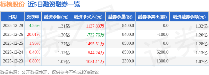 标榜股份融资融券信息显示,融资方面,当日融资买入4093.75万元,融资偿还2955.92万元,融资净买入1137.83万元。融券方面,融券卖出0.0股,融券偿还0.0股,融券余量8400.0股,融券余额37.18万元。融资融券余额1.32亿元。