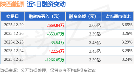 证券之星消息,12月29日,陕西能源(001286)融资买入4703.24万元,融资偿还2033.4万元,融资净买入2669.84万元,融资余额3.66亿元。