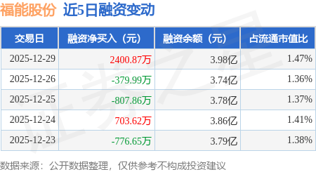 证券之星消息,12月29日,福能股份(600483)融资买入4297.74万元,融资偿还1896.87万元,融资净买入2400.87万元,融资余额3.98亿元。