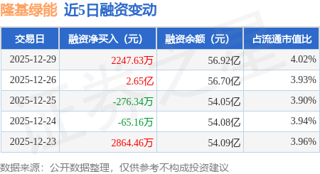 证券之星消息,12月29日,隆基绿能(601012)融资买入2.45亿元,融资偿还2.23亿元,融资净买入2247.63万元,融资余额56.92亿元。
