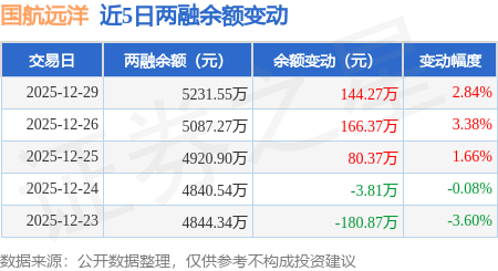 证券之星消息,12月29日,国航远洋(920571)融资买入570.28万元,融资偿还426.0万元,融资净买入144.27万元,融资余额5231.55万元,近3个交易日已连续净买入累计391.01万元。
