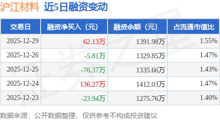 证券之星消息,12月29日,沪江材料(920204)融资买入135.23万元,融资偿还73.1万元,融资净买入62.13万元,融资余额1391.98万元。