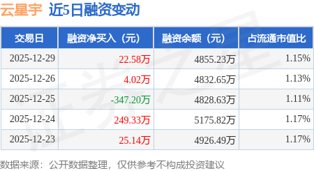 证券之星消息,12月29日,云星宇(920806)融资买入398.5万元,融资偿还375.92万元,融资净买入22.58万元,融资余额4855.23万元,近20个交易日中有12个交易日出现融资净买入。
