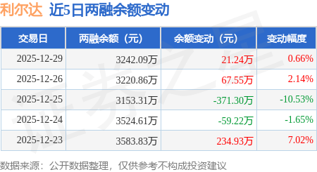 证券之星消息,12月29日,利尔达(920249)融资买入116.87万元,融资偿还95.63万元,融资净买入21.24万元,融资余额3242.09万元,近20个交易日中有11个交易日出现融资净买入。