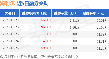 证券之星消息,12月29日,海利尔(603639)融资买入242.19万元,融资偿还248.51万元,融资净卖出6.32万元,融资余额1.1亿元,近20个交易日中有12个交易日出现融资净买入。