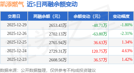 证券之星消息,12月29日,凯添燃气(920010)融资买入100.34万元,融资偿还149.05万元,融资净卖出48.71万元,融资余额2653.43万元。