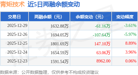 证券之星消息,12月29日,青矩技术(920208)融资买入63.36万元,融资偿还124.53万元,融资净卖出61.16万元,融资余额1632.88万元。