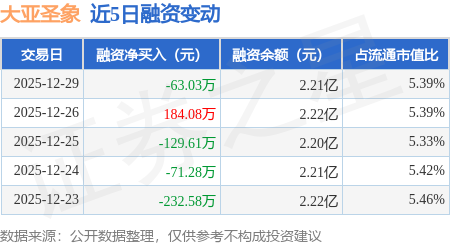 证券之星消息,12月29日,大亚圣象(000910)融资买入399.58万元,融资偿还462.61万元,融资净卖出63.03万元,融资余额2.21亿元。