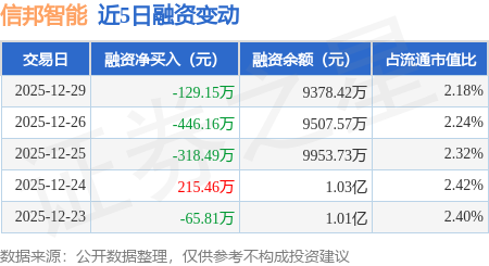 证券之星消息,12月29日,信邦智能(301112)融资买入442.95万元,融资偿还572.1万元,融资净卖出129.15万元,融资余额9378.42万元。