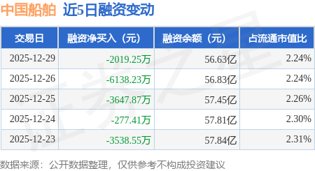 证券之星消息,12月29日,中国船舶(600150)融资买入1.07亿元,融资偿还1.27亿元,融资净卖出2019.25万元,融资余额56.63亿元。
