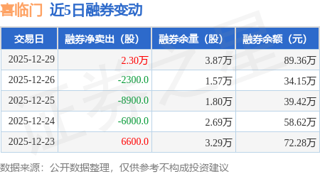 证券之星消息,12月29日,喜临门(603008)融资买入1.13亿元,融资偿还1.41亿元,融资净卖出2819.97万元,融资余额6.61亿元,近20个交易日中有12个交易日出现融资净买入。