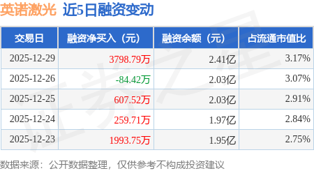 证券之星消息,12月29日,英诺激光(301021)融资买入9438.33万元,融资偿还5639.54万元,融资净买入3798.79万元,融资余额2.41亿元。