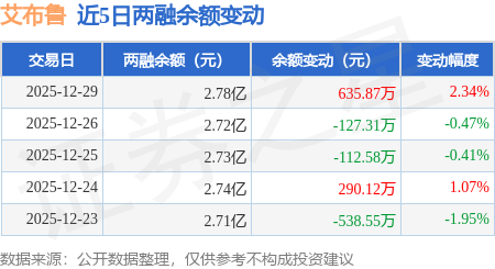 证券之星消息,12月29日,艾布鲁(301259)融资买入2223.32万元,融资偿还1587.45万元,融资净买入635.87万元,融资余额2.78亿元。