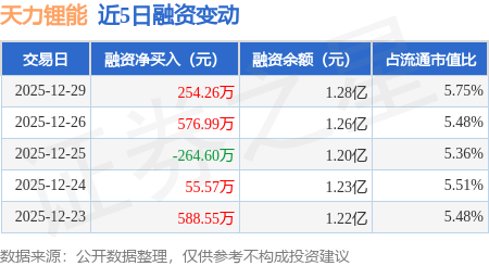 证券之星消息,12月29日,天力锂能(301152)融资买入1370.79万元,融资偿还1116.52万元,融资净买入254.26万元,融资余额1.28亿元。