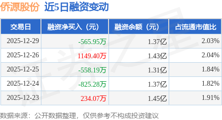 证券之星消息,12月29日,侨源股份(301286)融资买入1425.06万元,融资偿还1991.01万元,融资净卖出565.95万元,融资余额1.37亿元。