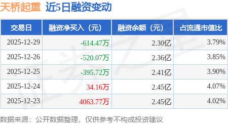 证券之星消息,12月29日,天桥起重(002523)融资买入1276.62万元,融资偿还1891.08万元,融资净卖出614.47万元,融资余额2.3亿元。