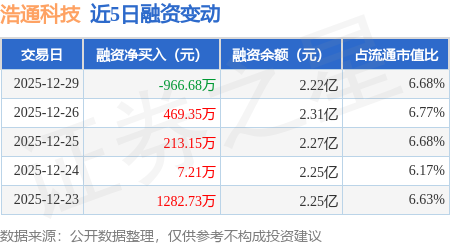证券之星消息,12月29日,浩通科技(301026)融资买入4587.18万元,融资偿还5553.86万元,融资净卖出966.68万元,融资余额2.22亿元,近20个交易日中有12个交易日出现融资净买入。